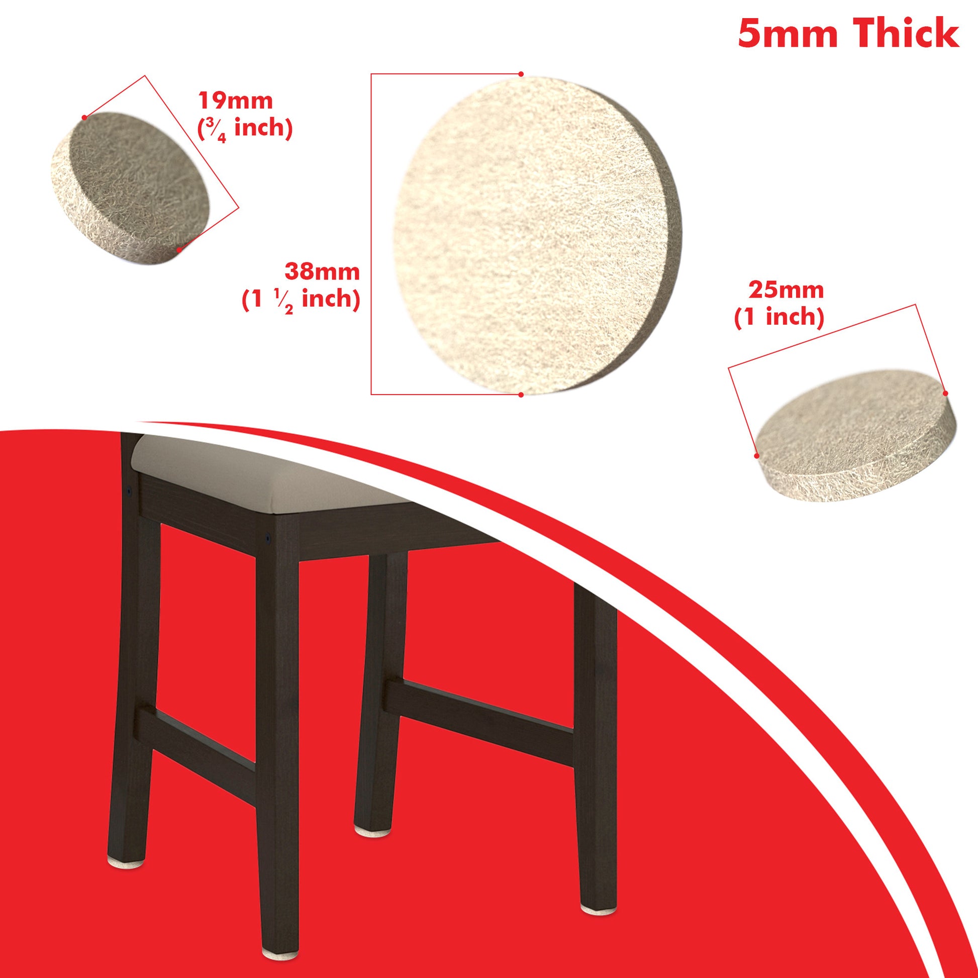 All of the different sizes and their quantity are chosen to suit most furniture in your home & office & avoid wastage. Can be applied to furniture legs and unlike cheaper furniture felt pad alternatives which are usually 0.118 inch (3mm) thick, these 0.197 inch (5mm) thick pads provide a thicker protective scratch proof barrier between furniture & hard surfaces.